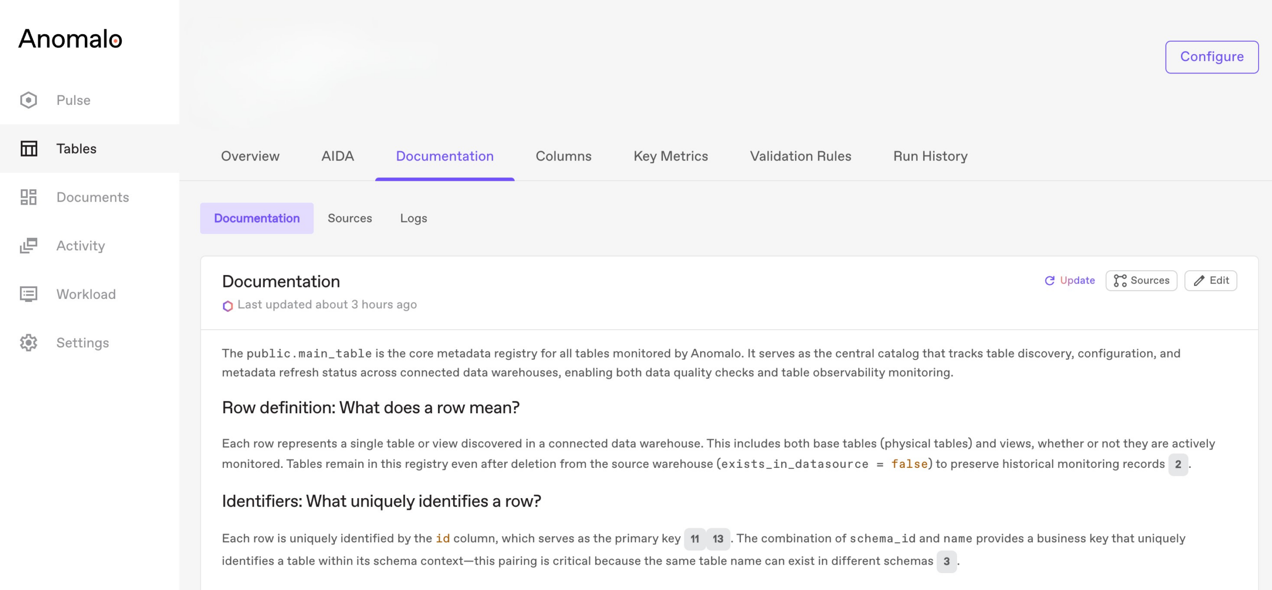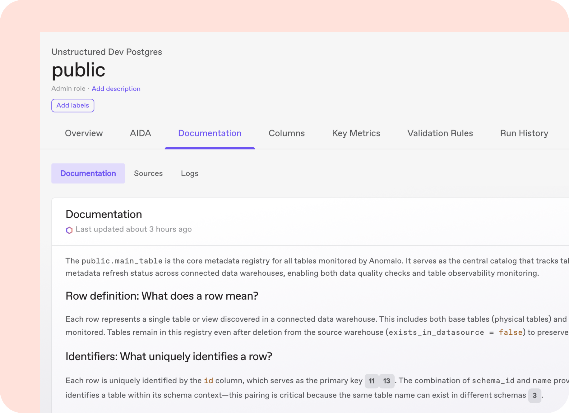 When the Data Documentation Agent documents a table, it doesn’t just help humans, it gives AIDA – Anomalo’s Intelligent Data Analyst, the deep context it needs to answer questions accurately. Business terminology, table ownership, schema nuance, and more all available at query time.